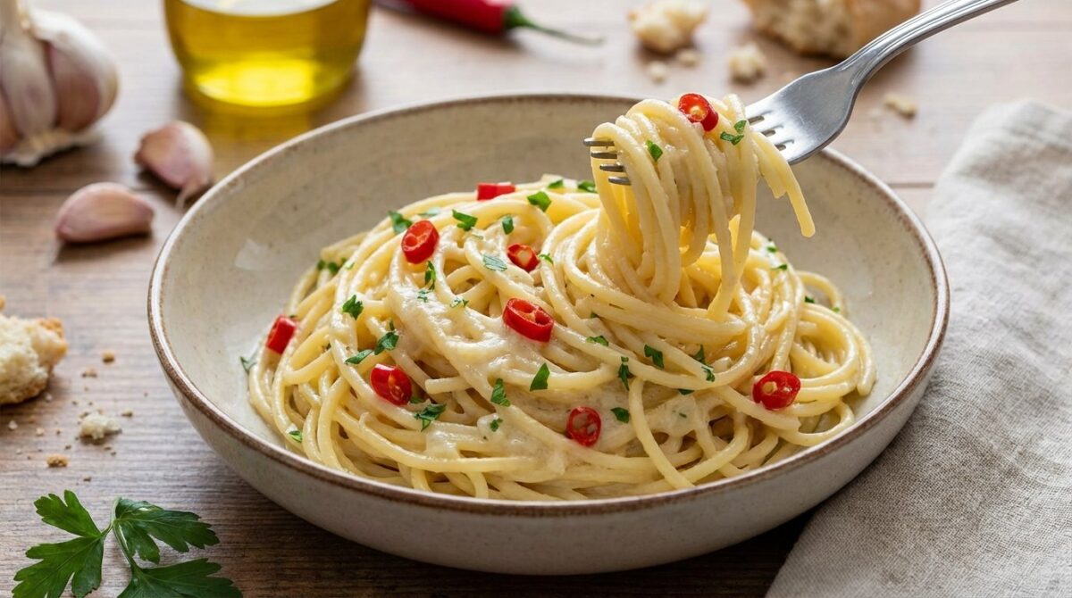 La versione degli spaghetti aglio, olio e peperoncino di Antonino Cannavacciuolo trasforma questo classico in un’esperienza quasi setosa, grazie a